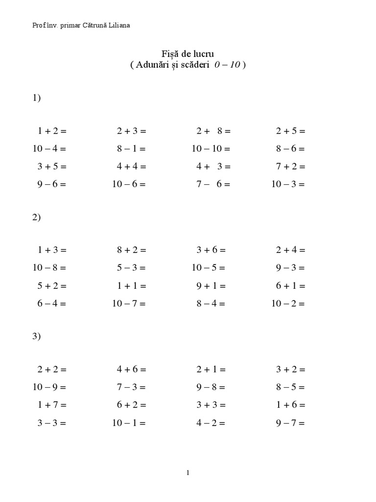 Fise De Lucru Clasa Pregatitoare Matematica 0-10. Ai obținut 0 din 0 de puncte posibile, (0). Aceasta fisa de lucru contine 4 exercitii de matemtica si logica pentru copii din clasa 0. Buna, ma bucur foarte mult ca ai ajuns aici! Fişă de lucru cu adunări, scăderi, înmulţiri, cu exerciţii şi probleme, gratuită şi uşor de printat. Colecție de la zirbo rebeca.