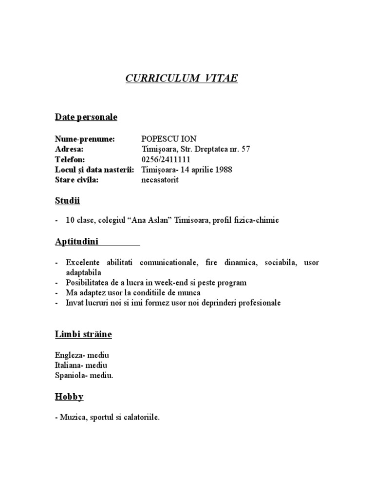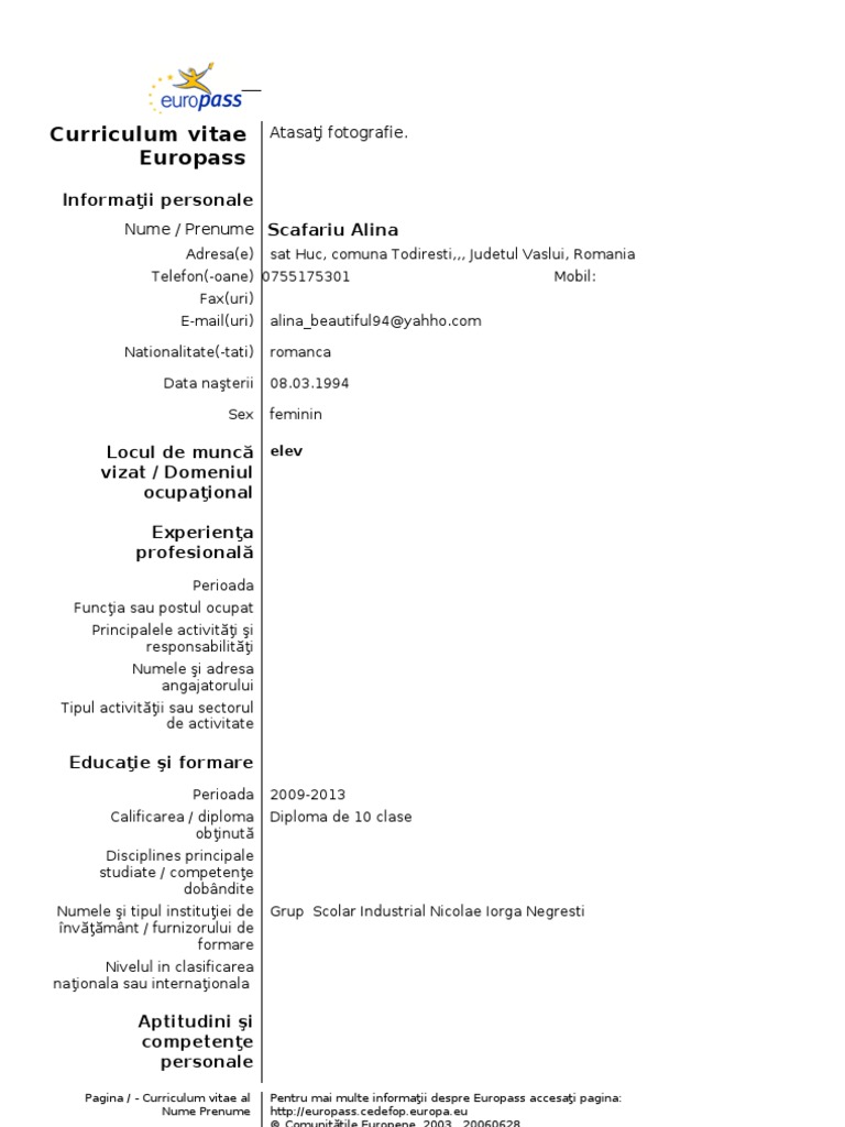 Curriculum vitae europass informatii personale nume prenume popescu ion andrei adresae bd ul alba iulia nr12 bl. Modelele facute publice de catre agentia europeana europass sunt disponibile mai jos. Daca ai vreo intrebare legata de cv, sunt la dispozitia ta sa te ajut!