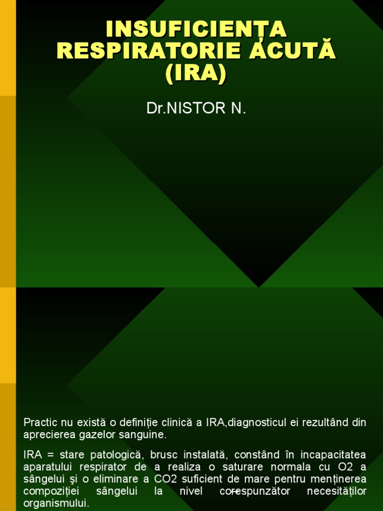 vizitati articolul complet aici : https://www.slideshare.net/alexandrakaly/respirator Insuficienta respiratorie acuta reflecta definitie: L'insufficienza respiratoria acuta ipossiemica consiste in una grave ipossiemia arteriosa refrattaria alla terapia con ossigeno una volta diagnosticata l'insufficienza respiratoria acuta ipossiemica, bisogna stabilire la causa, considerando sia le cause polmonari che. Cand se intampla acest lucru, plamanii nu pot elibera oxigen in sange si, la randul lor, organele nu pot obtine suficient sange bogat in oxigen pentru a functiona.