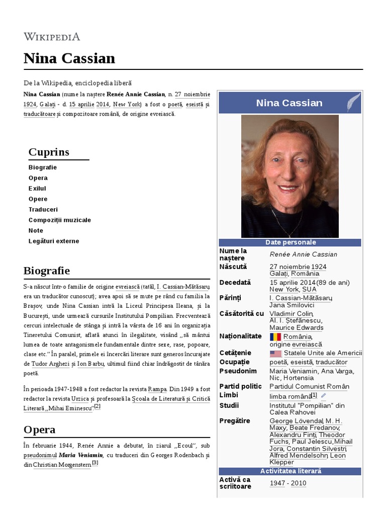 Nina cassian, o personalitate remarcabilă, nu de puţine ori controversată şi contestată, cu o revenire spectaculoasă în peisajul literaturii contemporane din românia odată cu apariţia volumelor spectacol în aer liber şi confidenţe fictive, este protagonista întâlnirii de la bistrot de venise. In urma unui atac ideologic lansat in ziarul scanteia la adresa ei, incepe sa scrie treptat si poezie proletcultista. Transport gratuit peste 150 de lei.