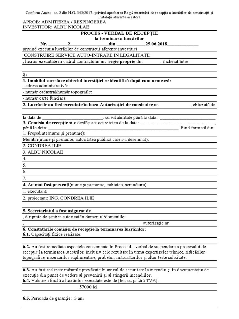 Receptia lucrarilor de constructii de orice categorie si de instaltii se efectueaza atât la lucrari noi, cât si la interventii in timp asupra constructiilor existente, conform legii. Ce este un proces verbal de recepție la terminarea lucrarilor de constructii. Proces verbal receptie lucrari colegiul tehnic al dirigintilor de santier …